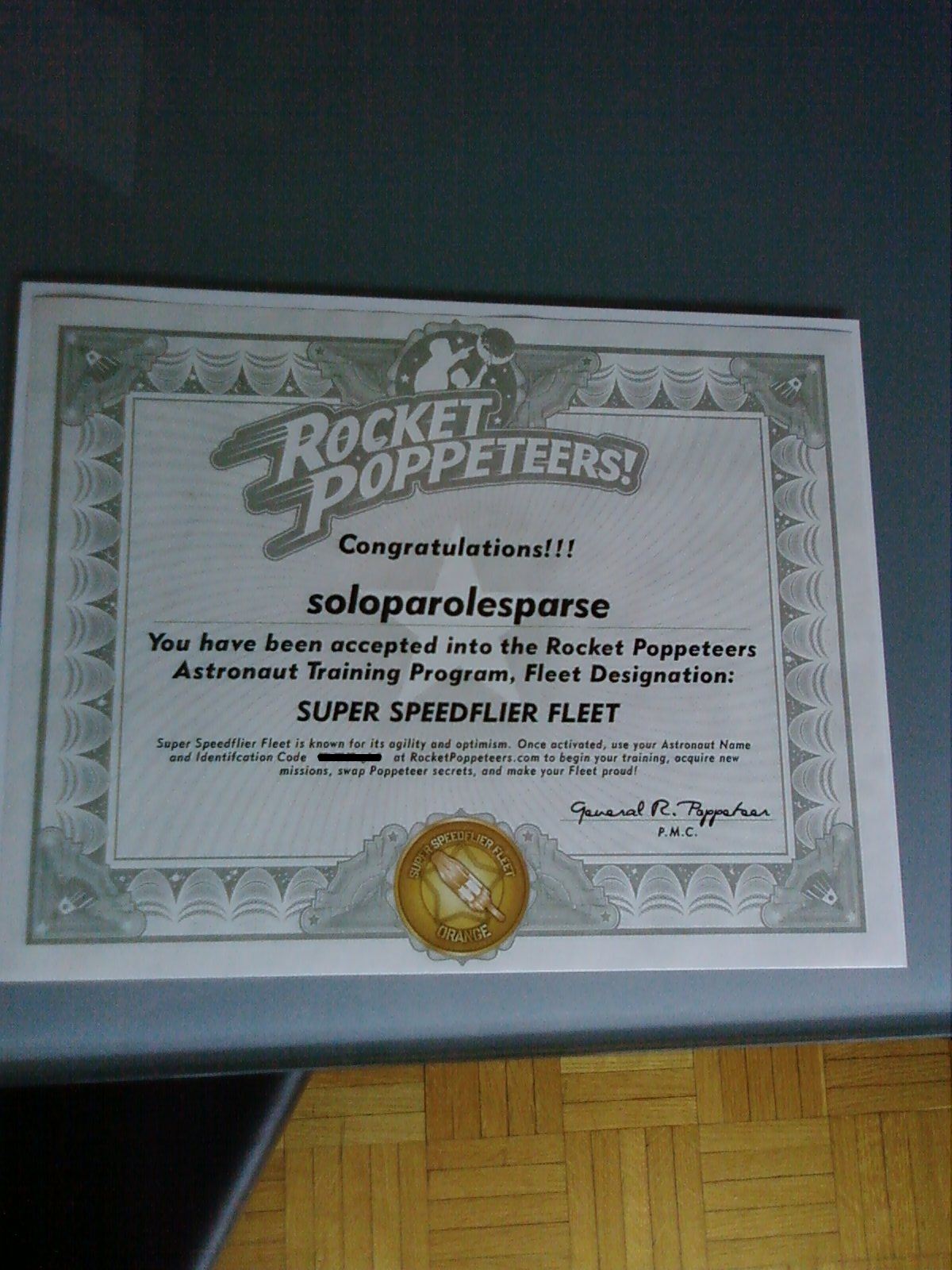 Il certificato è firmato dal Generale R. Poppeteer in persona, è su splendida carta finto filigranata e riporta il logo e perfino un timbro dorato col gelatino e la scritta “Super Speedflier Fleet – orange”, che pare essere la mia specialità.
