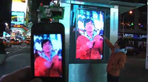 I due collegano poi un trasmettitore di loro invenzione all’apperecchio Apple e girano per le strade riuscendo ad inviare il segnale sui vari maxischermi pubblicitari che affollano la piazza, mandando così in onda il loro video praticamente ovunque con imbarazzante semplicità.