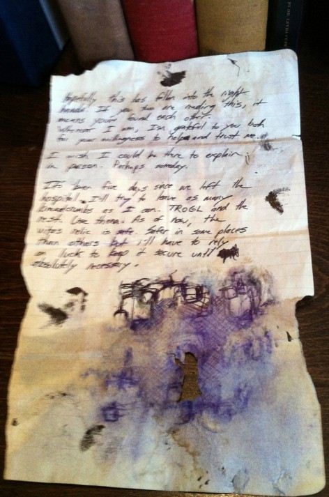 Un fogliettino con una scritta ed un disegno molto sbiadito, praticamente illegibile, un fogliettino molto rovinato.