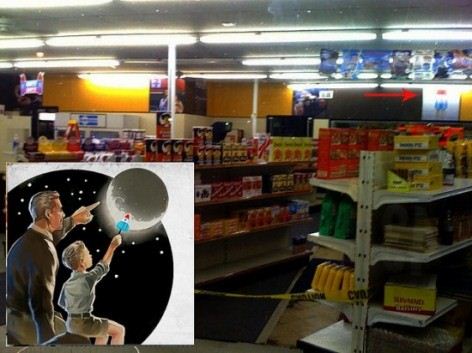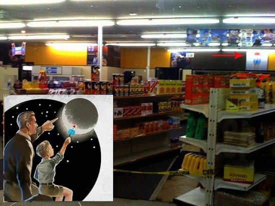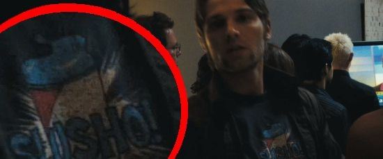 Slusho compare su un cartello dall’aspetto retrò appeso nella sequenza nel negozio di Kelvin in Super 8. Sfortunatamente, non sono riuscito a trovare uno screenshot chiaro da uno dei trailer, spot tv o clip. Sopra potete vedere il logo decisamente sulla sinistra nella prima immagine, e subito dietro il lato sinistro della testa dell’ impiegato nella seconda immagine.