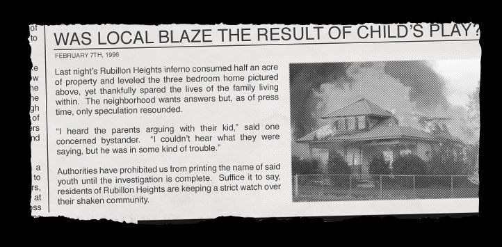 Blameless è un ritaglio di giornale che ricorda un misterioso incendio del 7 febbraio 1996