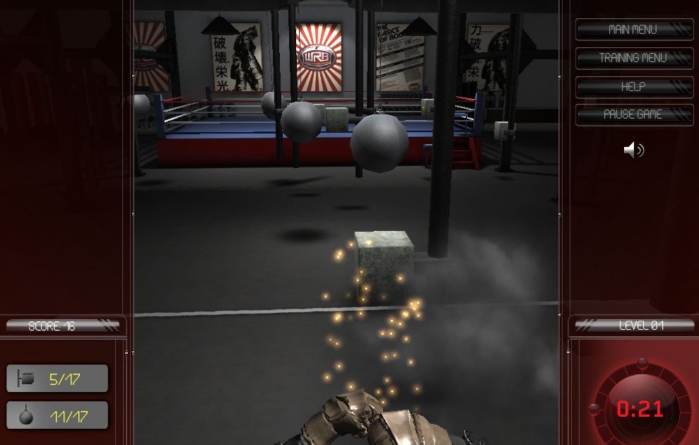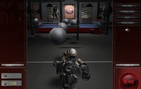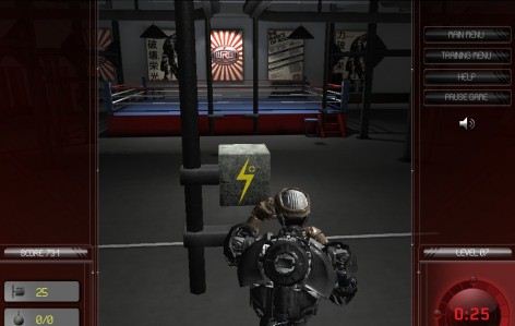 In una palestra attrezzata di vari strumenti il robottino aspirante pugile può allenarsi a colpire blocchi di cemento con Strike Training.
