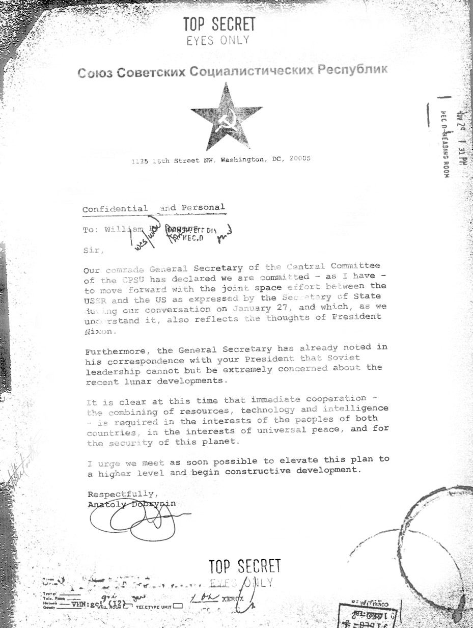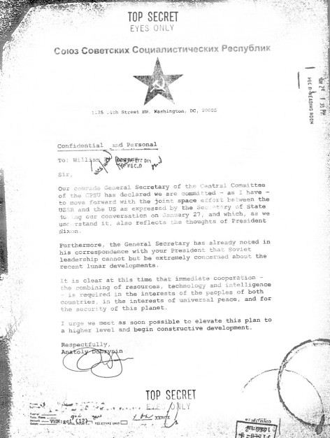 Un po’ più interessante è questo messaggio spedito dal colonnello russo Anatoly Dobrynin agli Stati Uniti, in cui propone, data la difficile situazione in cui ci si è imbattuti sulla luna, una tregua nei rapporti USA-URSS per concentrarsi uniti nell’affrontare il problema alieno.