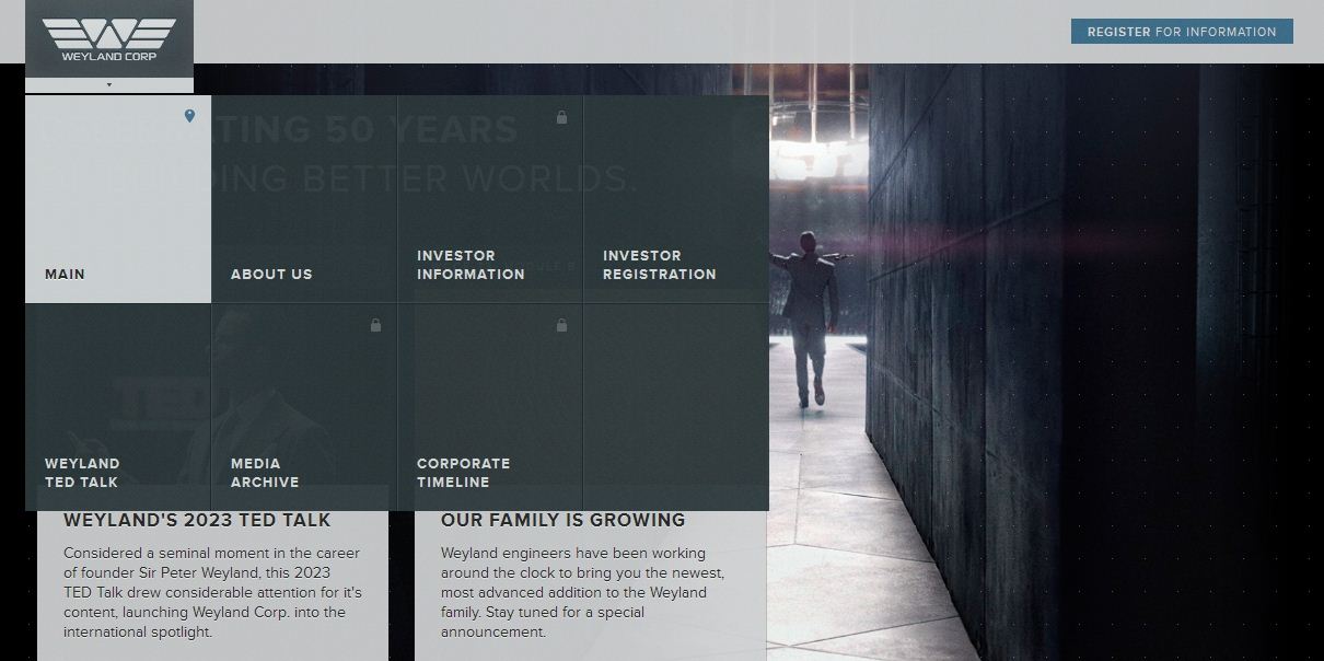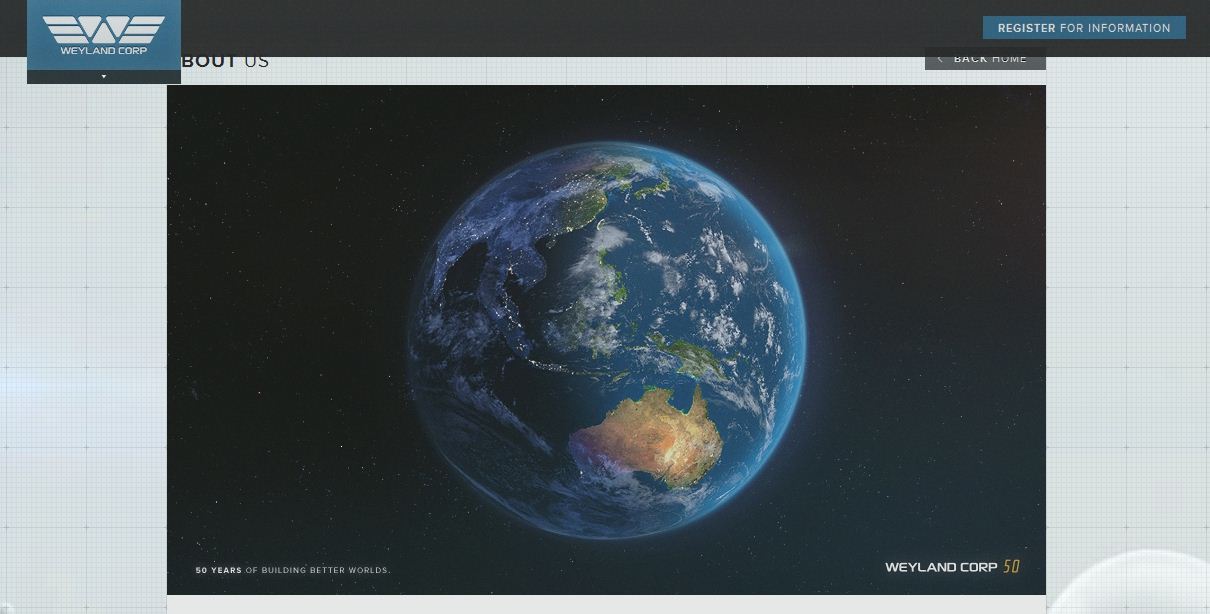 Il primo è un about us che racconta in breve i 50 anni in cui la Weyland ha cambiato il mondo dando degli impressionanti dati sullo sviluppo della società: succursali in 160 paesi (e 63 colonie) e 800 milioni di impiegati.