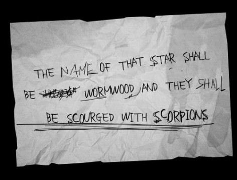 Quello che vedete qui sopra è un foglietto che è stato trovato nello zaino di Carrie e la frase è una citazione biblica: The name of that star shall be wormwood and they shall be scourged with scorpions”.