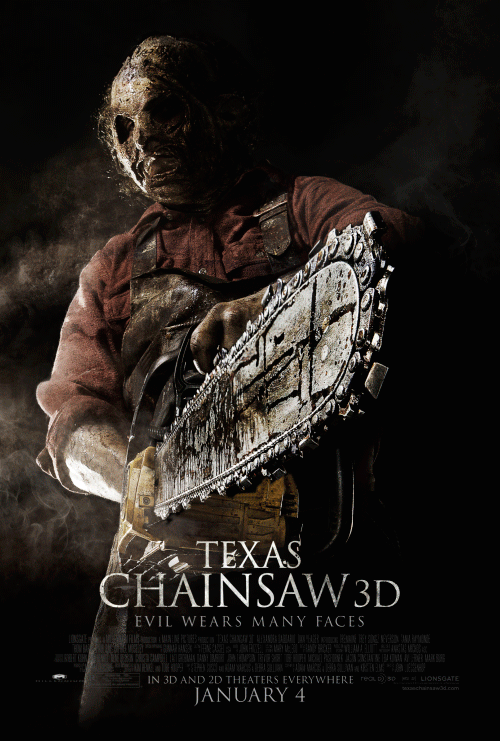 L’immagine della settimana è la locandina animata di Non aprite quella porta 3D, il remake naturalmente. In primo piano Leatherface e la sua sega elettrica che sembra quasi sbucare fuori (in maniera vagamente fallica) dalla locandina per minacciare lo spettatore (per vedere la locandina animarsi vi tocca cliccarci sopra).