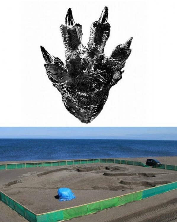Un’impronta di Godzilla è stata trovata su una spiaggia in Giappone. Si tratta di un’orma enorme che potete vedere nella foto qui sotto. 27,9 metri di lunghezza per 22 metri di larghezza.